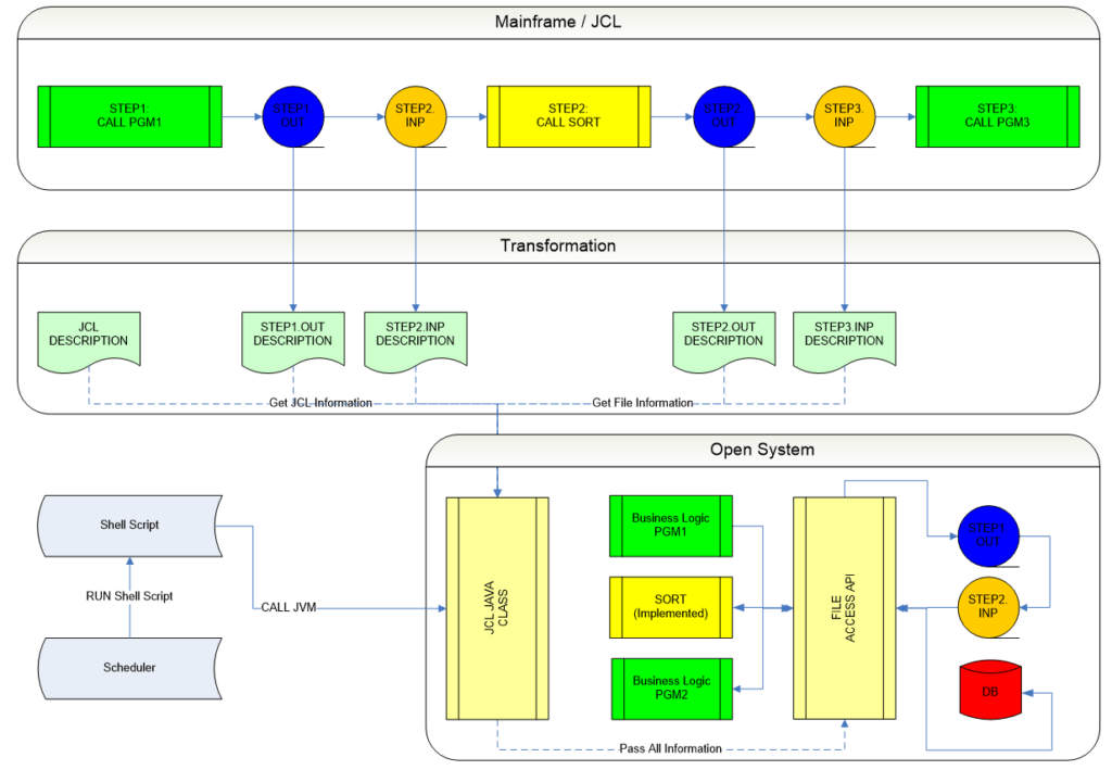 変換されたJCL言語のスクリプトソリューションは、以下を提供することで、オープンシステム環境に実装され、同じ機能が保証されます。: