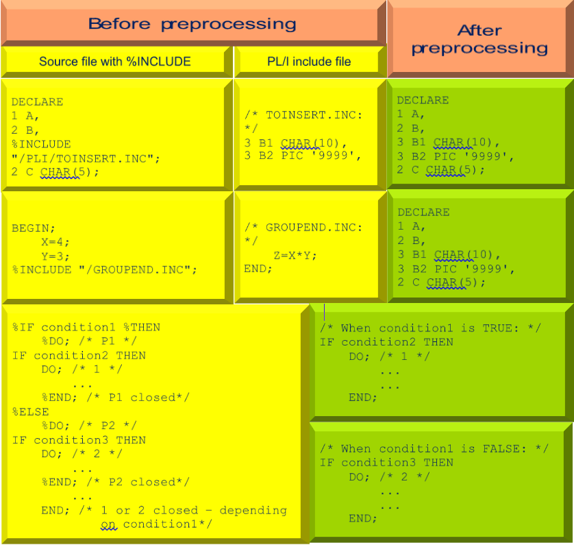 PL / I言語からJava言語への変換課題の1つには、%INCLUDE、%DECLARE、%ACTIVATE、%IF – %THEN – %ELSE、%DO – %ENDなどのプリプロセッサ処理があります。